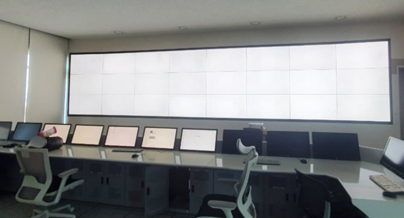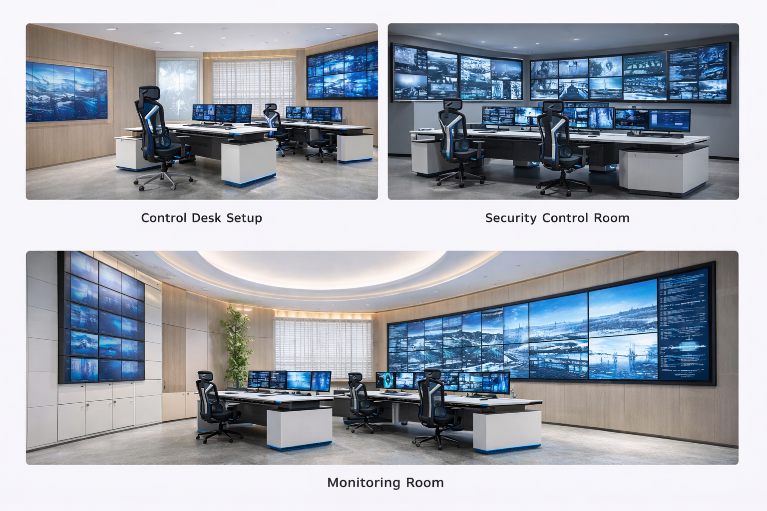 Modern control room consoles built for security operations and video monitoring. Professional security control room