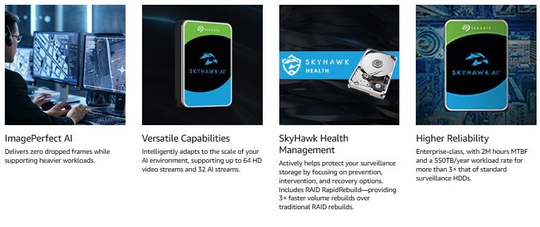 SkyHawk AI 10TB is designed for use in video and imaging applications. Developed with advanced features, it's suitable for AI NVRs, servers, appliances with AI analytics, and deep learning capabilities. Supporting over +10,000 hours of video and analytics and boosting the heavy workloads of AI-enabled 24×7 surveillance systems, SkyHawk AI supports 3× the workload of standard surveillance drives and includes SkyHawk Health Management and Rescue Data Recovery Services.