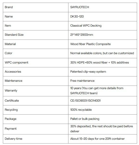 This WPC decking features an impressive 3D deep embossed surface that creates a realistic wood grain effect, adding depth and visual appeal to any outdoor area. It has a substantial thickness of 30mm, providing exceptional structural stability and resistance to heavy foot traffic, while the 120mm width offers flexibility for seamless installation. To meet unique design visions, the decking is fully customizable—customers can select from a wide range of lengths, colors, and pattern to complement their outdoor decor. Crafted from high-quality WPC (Wood-Plastic Composite) materials, it boasts excellent weather resistance, standing up to rain, UV rays, and temperature fluctuations without warping or fading. As 120mm wide 3D deep embossed WPC decking, it’s not only easy to clean with just a simple wash but also retains its pristine look for years, making it a cost-effective and stylish choice for both homeowners and contractors.
