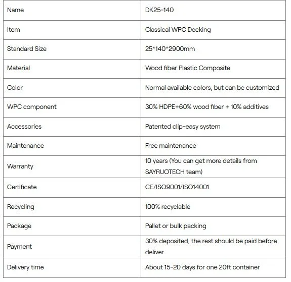 Made of high-quality wood-plastic composite, resists wear, rot and moisture, features realistic wood grain, comfortable feel and anti-slip properties, and offers a long-lasting and stylish outdoor decking solution.