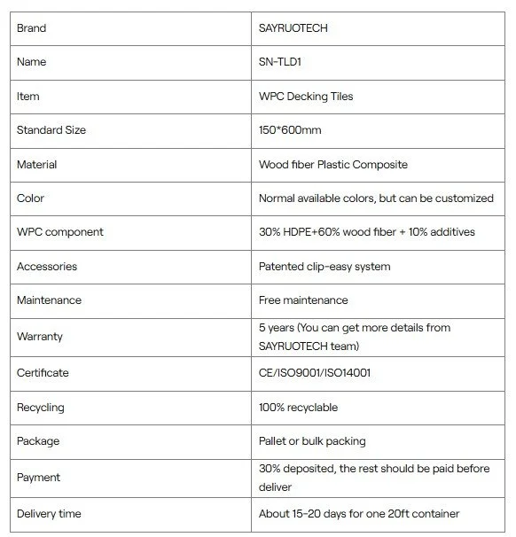 Crafted from high-density WPC, these decking tiles offer superior durability and resistance to rot, mold, and fading—perfect for withstanding outdoor elements. The weather-resistant WPC decking tiles with 3D embossing for patios retain their shape and color even in harsh conditions like heavy rain or intense sunlight.​ The realistic 3D wood grain embossing adds depth and visual appeal to your outdoor space, mimicking the look of natural wood without the high maintenance. The texture also provides enhanced slip resistance, ensuring safety for your family and guests.​The precision-engineered interlocking mechanism enables quick and easy installation—no glue, nails, or special tools required. Simply align the tiles and snap them together to create a seamless, stable floor. The low-maintenance WPC interlocking decking tiles for patio floors can be easily removed and reinstalled if needed, making them ideal for renters or seasonal updates.​​Made from recycled wood fibers and plastic, these WPC decking tiles are an environmentally friendly alternative to traditional wood or concrete flooring. They are also 100% recyclable, reducing your carbon footprint while enhancing your outdoor living space.