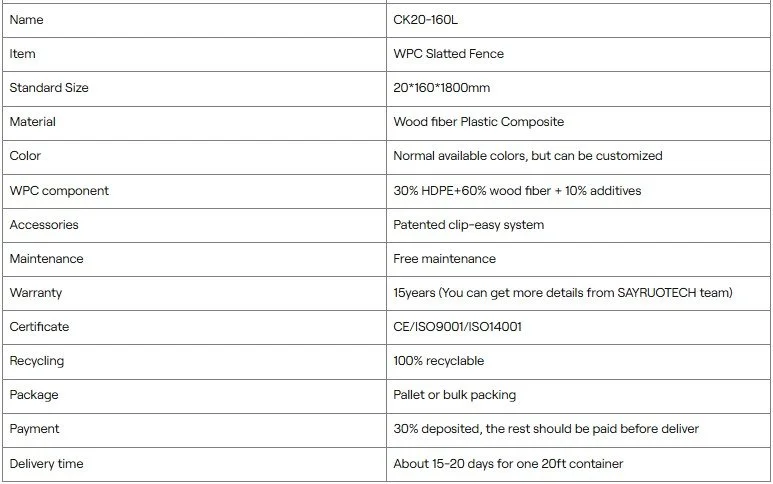 Item No : CK20-160L Made from high-quality Wood-Plastic Composite (WPC), this Co-extrusion slatted fence is designed to withstand harsh weather conditions while providing excellent privacy with its slatted design.