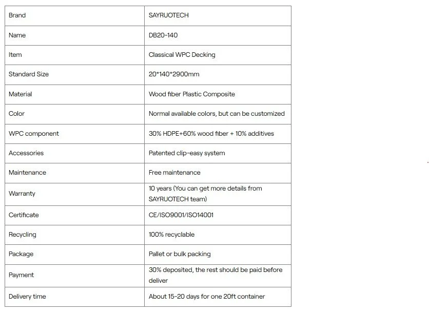 This WPC decking features an impressive 3D deep embossed surface that creates a realistic wood grain effect, adding depth and visual appeal to any outdoor area. It has a substantial thickness of 20mm, providing exceptional structural stability and resistance to heavy foot traffic, while the 140mm width offers flexibility for seamless installation. To meet unique design visions, the decking is fully customizable—customers can select from a wide range of lengths, colors, and pattern to complement their outdoor decor. Crafted from high-quality WPC (Wood-Plastic Composite) materials, it boasts excellent weather resistance, standing up to rain, UV rays, and temperature fluctuations without warping or fading. As 140mm wide 3D deep embossed WPC decking, it’s not only easy to clean with just a simple wash but also retains its pristine look for years, making it a cost-effective and stylish choice for both homeowners and contractors.