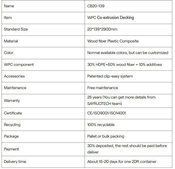 This solid WPC co-extrusion decking features a robust 20mm thickness and a practical 139mm width, striking the perfect balance between sturdiness and seamless installation—its solid core ensures enhanced load-bearing capacity, making it suitable for both residential and commercial use. To cater to diverse project needs, full customization is available: choose from flexible lengths to minimize waste and fit unique spaces, select from a wide range of colors (including natural wood tones and contemporary shades), and opt for realistic wood grain patterns, embossed textures, or smooth finishes to align with your design aesthetic. The co-extrusion process adds an extra layer of protection, boosting its resistance to water, scratches, and UV damage, while the solid structure eliminates hollow spots, enhancing overall durability and reducing noise underfoot.