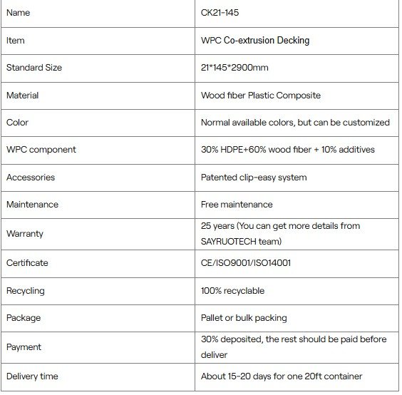 WPC Co-extruded hollow Decking CK21-145, blending recycled wood fibers and plastics, boasts a realistic wood look. Its solid core and co-extruded layer ensure strength, wear resistance. Durable, low-maintenance, eco-friendly, and slip-resistant, it fits outdoor decks, patios, and landscape projects.